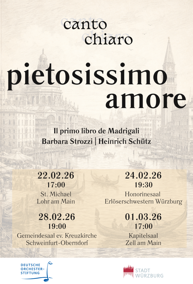 Mit dem neuen Programm pietosissimo amore stellt canto chiaro zwei außergewöhnliche Stimmen des Frühbarock gegenüber: Barbara Strozzi, eine der wenigen gefeierten Komponistinnen ihrer Zeit, und Heinrich Schütz, den wohl bekanntesten deutschen frühbarocken Komponisten. Beide veröffentlichten ihr "Primo Libro de’ Madrigali" in Venedig: Schütz 1611 als neugieriger Lernender, Strozzi 1644 als zentraler Bestandteil der blühenden venezianischen Musikszene.